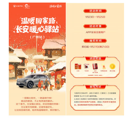 与此同时,长安汽车同步开启长安“引力域”APP线上温暖平台,构建全天候、多渠道的服务体系。返乡旅客可参与APP内“长安温暖回家路 马上行”抽奖赢好礼活动,现场扫码注册更可解锁专属权益,线上线下,温暖实时相伴。